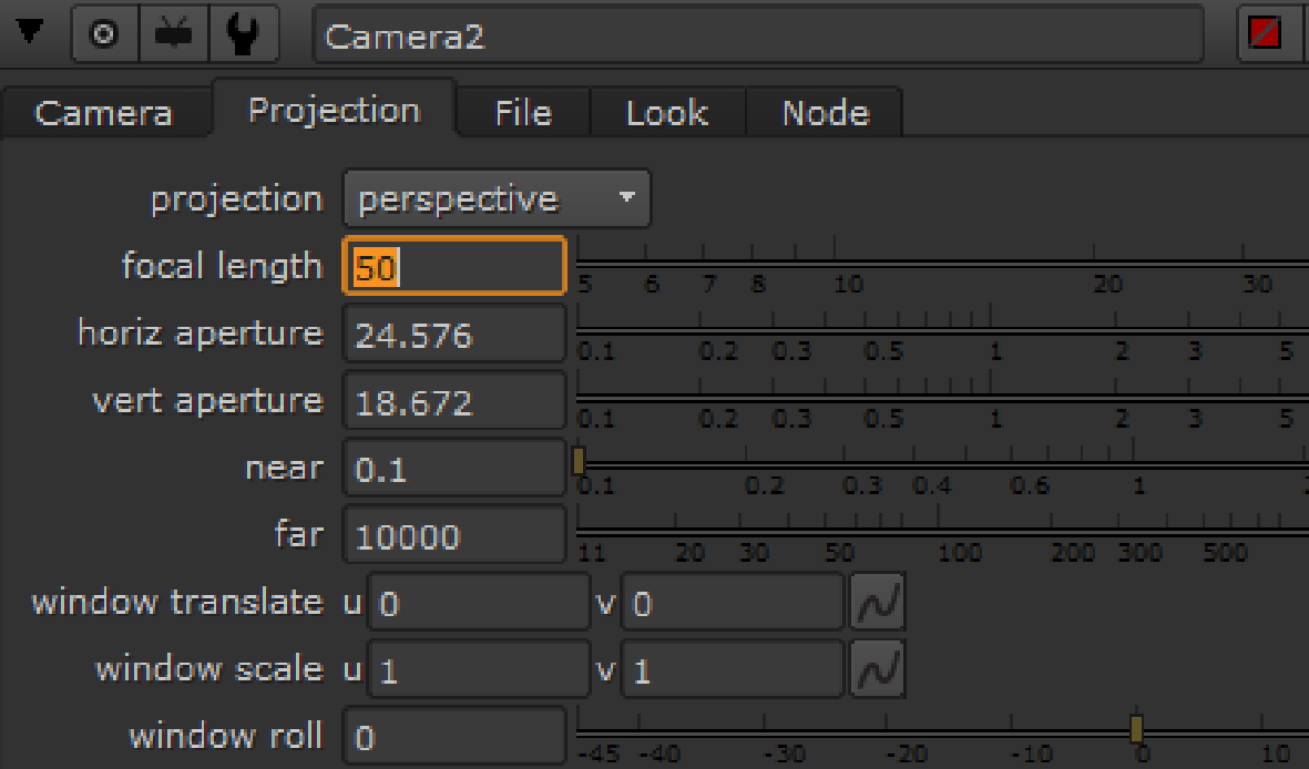 | 7. | Click the Projection tab in the camera’s panel and then enter the information you gathered for focal length, horiz aperture, and vert aperture. |