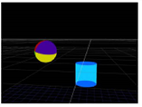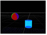 Another use of the TransformGeo node is to have the rotation of one object depend on the position of another so that the first object is always rotated to face or “look at” the second one. For example, you can have a sphere object always facing a cylinder object, regardless of the cylinder’s position. When the cylinder is moved to a new position, the sphere is automatically rotated to face it.