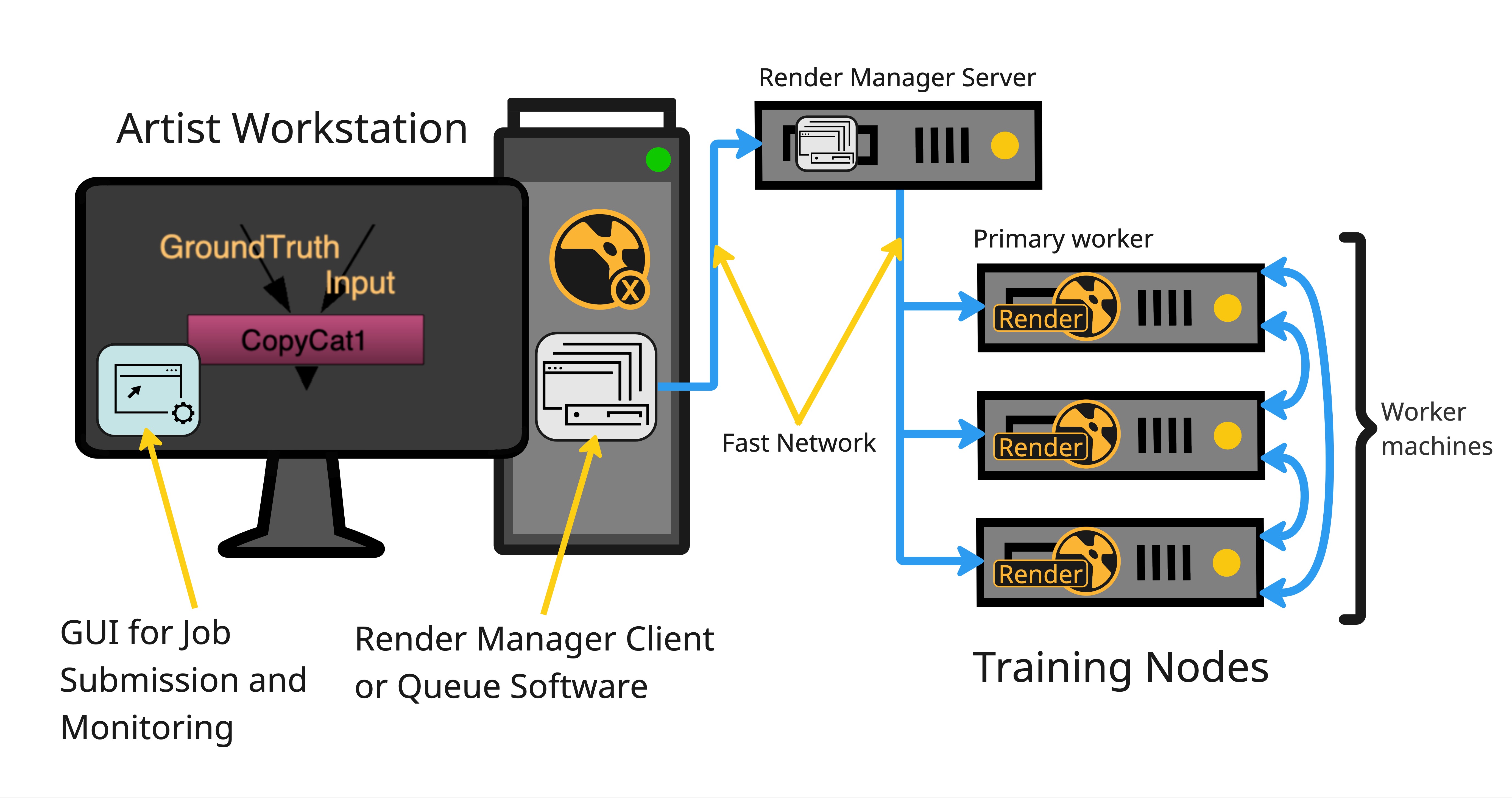 As an artist, you work as normal on your workstation and the render manager handles the distribution of training tasks to the available workers. The image shows a typical distributed training set up using a render manager to distribute the training load.