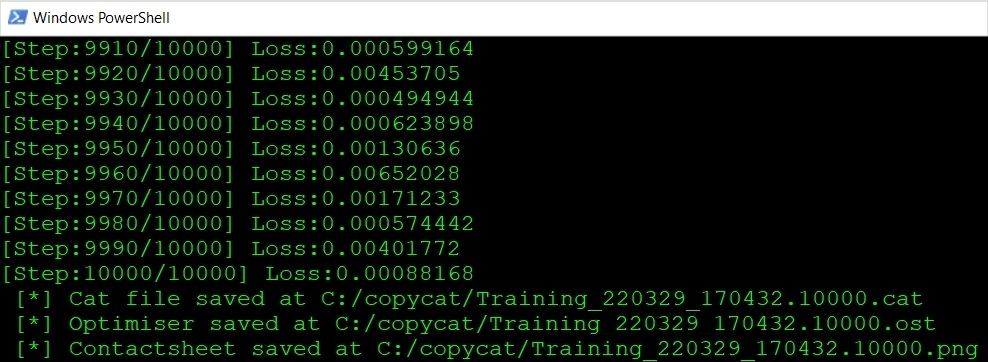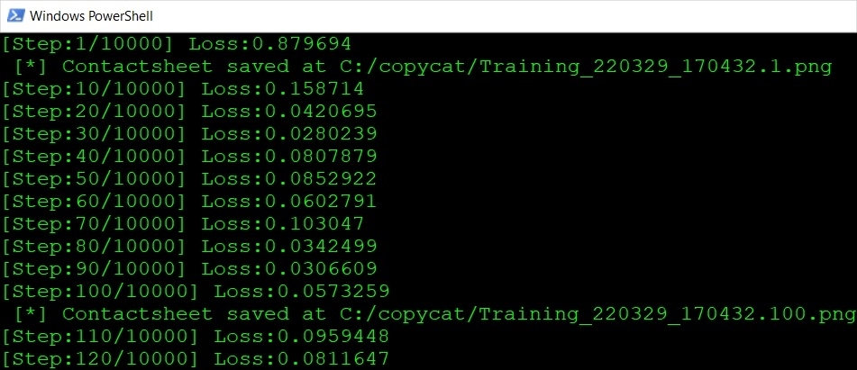 Running a script from the command line trains the network in exactly the same way as with an interactive GUI session, generating the same .png, .cat, .ost, and .summary files in the chosen Data Directory. Contact sheets and Step/Loss graphs are not displayed in command line mode, but the Step count and current Loss value are printed on-screen.