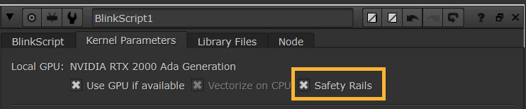 Turn on Safety Rails in the Kernel Parameters tab to catch common errors when prototyping BlinkScript kernels. When this option is enabled, additional code is generated to check for, catch and safely handle out-of-bounds memory accesses, which are a common cause of BlinkScript crashes.