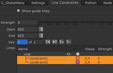 • Strength - sets the strength bias for the constraint. Increasing the strength of a constraint forces the warped output to converge at the constraint. Constraints have a similar weighting to user matches in C_CameraSolver.