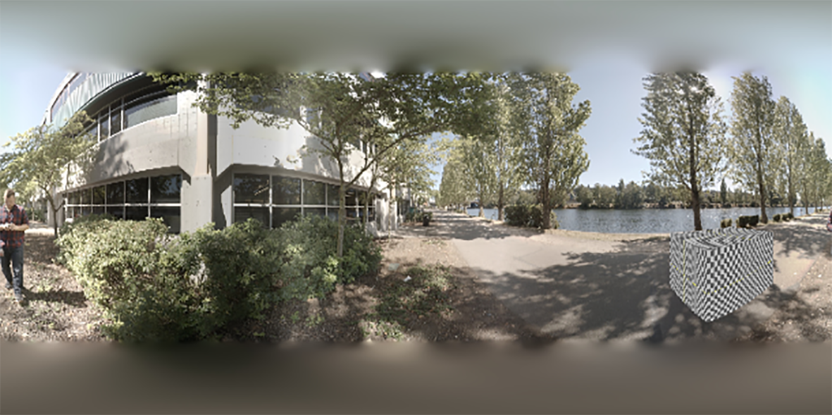 | 6. | You can also examine the scene in the 3D Viewer by pressing Tab. Navigate around the 360° scene using the standard Nuke navigation controls: Ctrl/Cmd to rotate the camera and Alt to pan. |