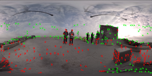 When the solve is complete, the Viewer displays the tracked features with solve data applied. Green features represent good solve data and red features represent poor solve data.