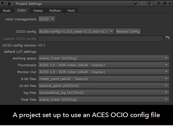 The color management dropdown determines whether Nuke uses the color transforms read from the configuration specified or the Nuke native transforms. Selecting OCIO makes the relevant OCIO transforms available to the Read and Write nodes in scripts on a per project basis.
