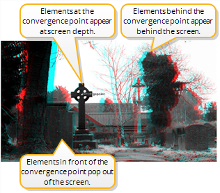At the convergence point, the different views in the image are aligned and appear at screen depth when viewed with 3D glasses. Anything behind the convergence point appears behind the screen, while anything in front of it seems to pop out of the screen. This is illustrated in the figure below.