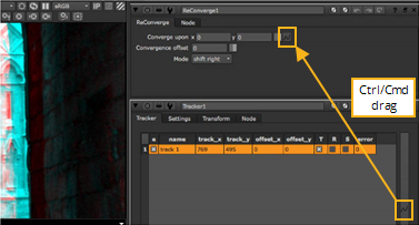 | 3. | When you have the track animation data, apply it to the ReConverge node’s Converge upon control via a linking expression. The easiest way to do this is to Ctrl/Cmd+drag the animation button next to the tracks list to the animation button next to the Converge upon control. |