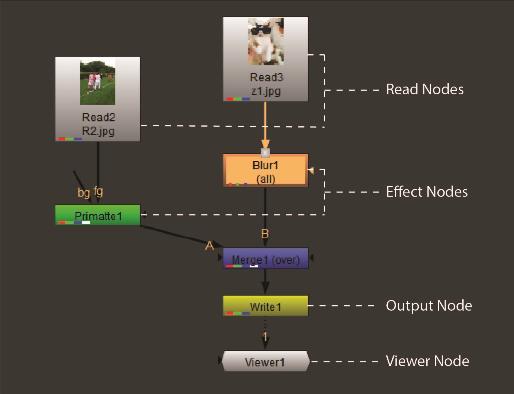In the image above, you see an example of a very simple Nuke script. Two Read nodes reference media on disk. Effect nodes extract a matte and blur an image. A Merge node set to over, composites the foreground image (input A) over the background image (input B). Finally, a Write node renders and outputs the completed composite to disk. There is also a Viewer node, which displays the output of any node in the script.
