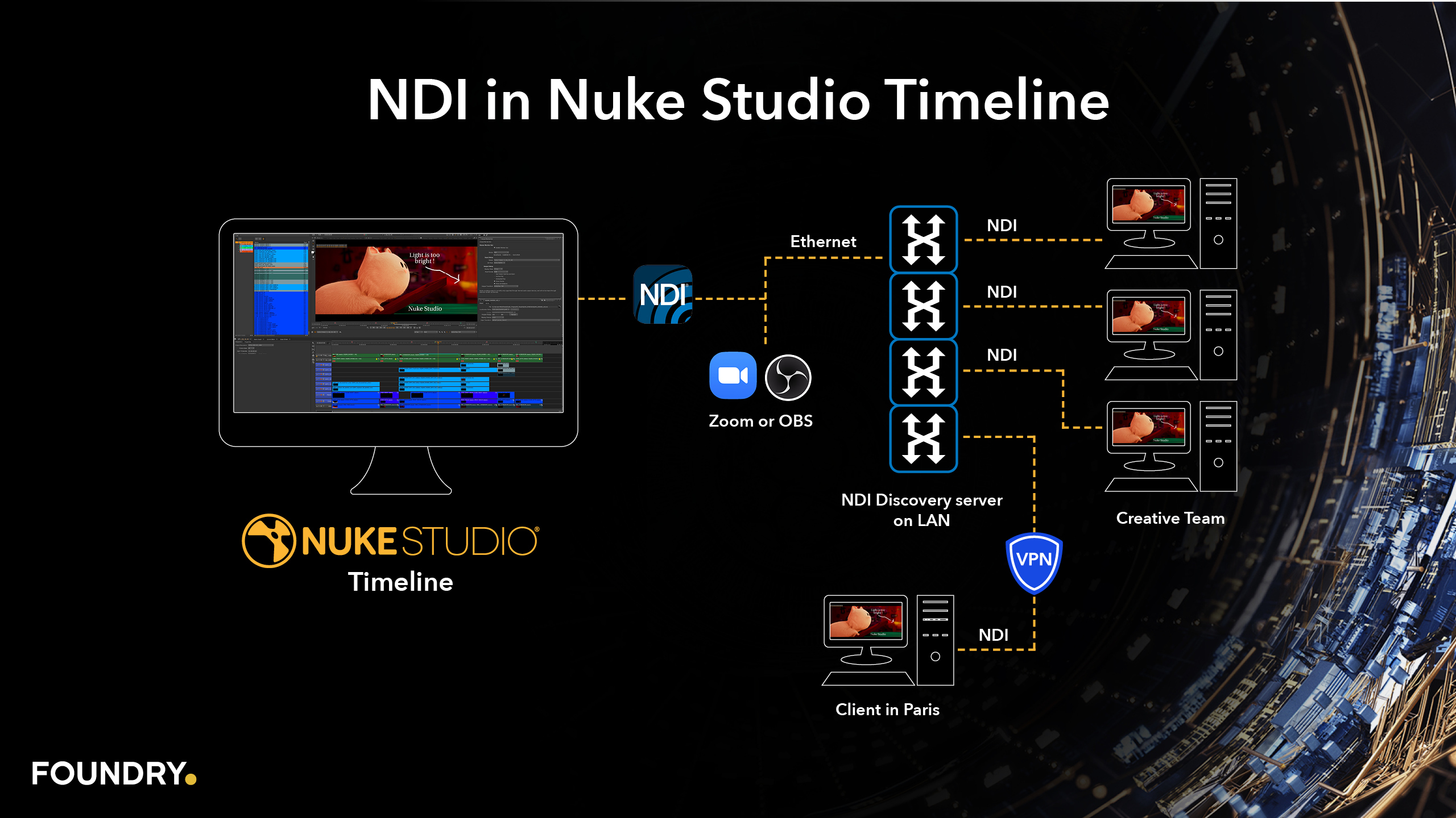 Network Device Interface, or NDI, is a network protocol from NewTek that enables you to send video, audio, and metadata signals over standard IP networks in real-time. NDI allows you to easily share a Nuke Viewer's output with anyone else on the same network.