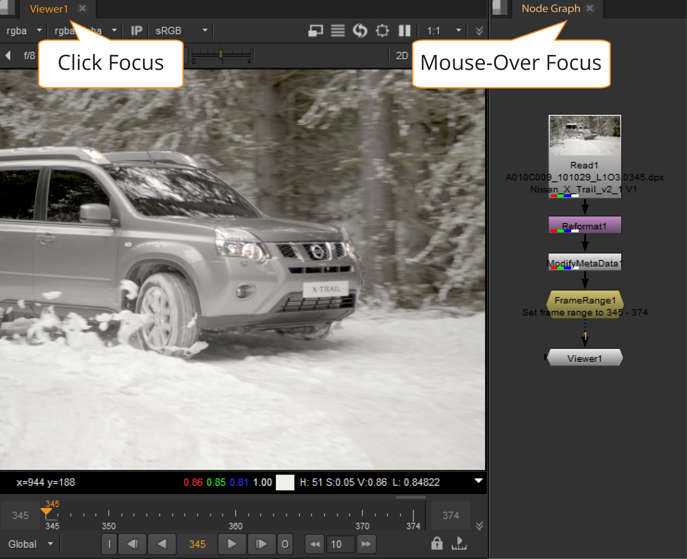 A good example of click focus versus mouse-over focus is between Viewers and the Node Graph: