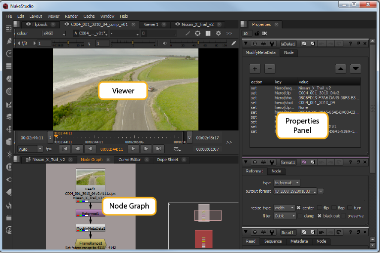 The Nuke StudioTimeline environment allows you to conform, create Nuke Comps, add soft effects, perform timeline-based editing, export your project, and view and edit metadata and properties. See Using Nuke Studio's Timeline Environment for more information.