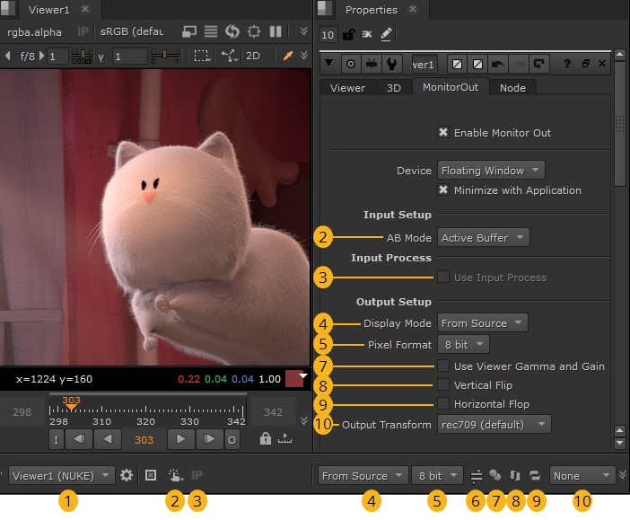 • Floating Window - Nuke's native monitor out uses a floating monitor and does not require additional hardware. Mac users can also take advantage of additional HDR technology including an extended sRGBf LUT. See Working with HDR Images for more information.