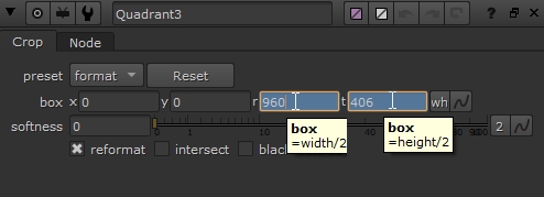 Each quadrant is a Crop node that defines which part of the overall image is handled by each Viewer. For example, Quadrant3 is set up as shown here, with simple expressions to handle different formats.