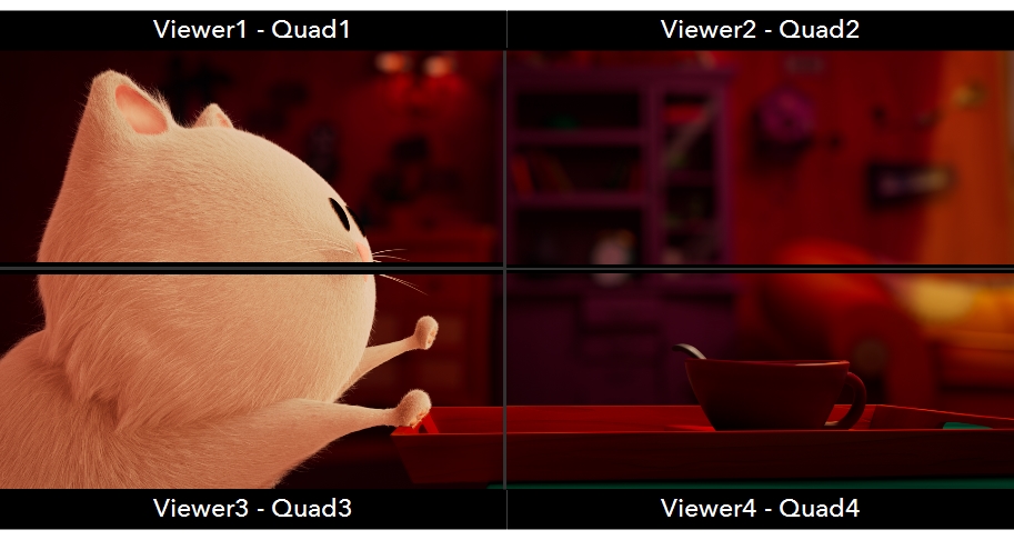 Using a similar four-Viewer setup, you could send four quadrants over NDI to four projectors to produce a larger image somewhere else on the same network. See Streaming Viewer Output Over the Internet with NDI® for more information.