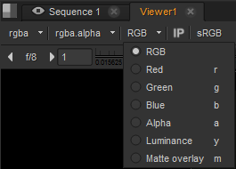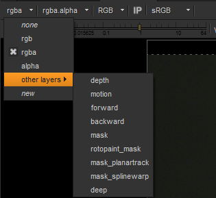 The layer dropdown menu lets you choose a set of color channels to display in the Viewer. By default, this is set to display the rgba layer, but you can choose any layer in the data stream.