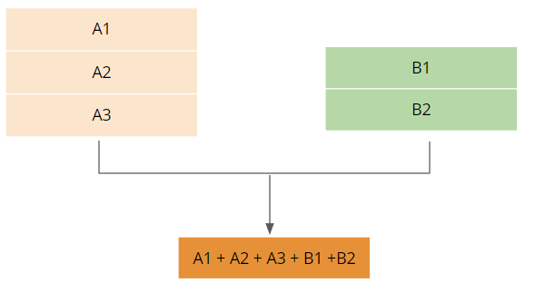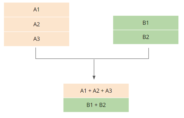 Duplicate Prims: The B input is merged intact and the A input is flattened using duplicate prims (the ‘ indicates a duplicate).