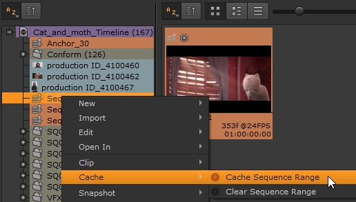 Select the required sequence in the Sequence tab, click the icon, and then select Cache Sequence Range.