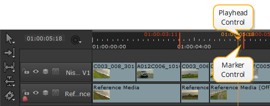 The timeline playhead indicates what is currently displayed in the Viewer using a number of different display markers. Swapping tracks between buffers automatically updates the playhead so that you always know which tracks you are looking at in the Viewer.