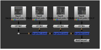 Note: The MultiTexture node at the end of the tree optimizes rendering when multiple MergeMat nodes are chained together. It uses the default Iop vertex shader and only handles multi-texturing. This node has no fields or knobs and is intended for use only with the UDIM Import operation.