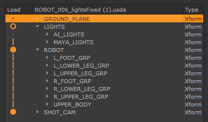 Light, camera, and axis items are loaded using the relevant native Nuke 3D nodes, Light, Camera and Axis. If there is only one item in the USD file, it loads automatically.