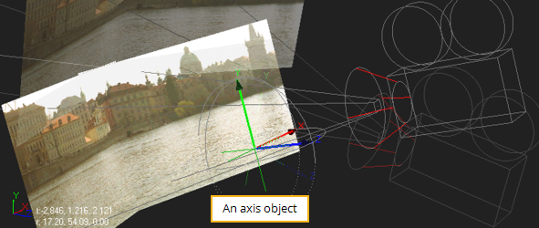For example, the Axis node has been parented to the other objects in the scenes (the two image planes and the camera). The result is an axis object that globally controls the scene. Rotating it, for example, rotates all objects in the scene, as the figure below shows.