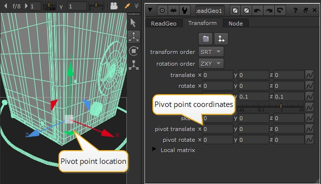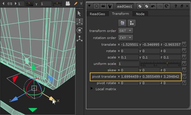 3. Or you can hold Ctrl/Cmd and drag the pivot point to translate it on the required axis. The pivot translate fields update as you drag the pivot point around the Viewer.