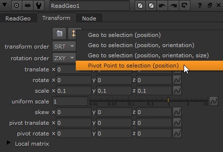 3. In the node's Properties panel, click the snap button and then select Pivot Point to selection (position) from the dropdown.