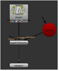 DepthToPoints is a gizmo containing the DepthToPosition and PositionToPoints nodes. It can be used to generate a 3D point cloud from a depth pass and 3D camera. DepthToPoints takes the depth data and color information contained in an image file and recreates the image as a 3D point cloud.