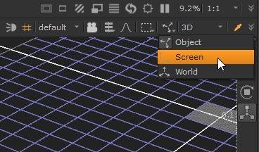 Transforming objects in the Viewer is available in three modes, object, screen, and world space. You can select which transform space you're using by clicking the