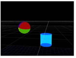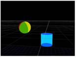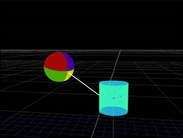 Another use of the TransformGeo node is to have the rotation of one object depend on the position of another so that the first object is always rotated to face or “look at” the second one. For example, you can have a sphere object always facing a cylinder object, regardless of the cylinder’s position. When the cylinder is moved to a new position, the sphere is automatically rotated to face it.
