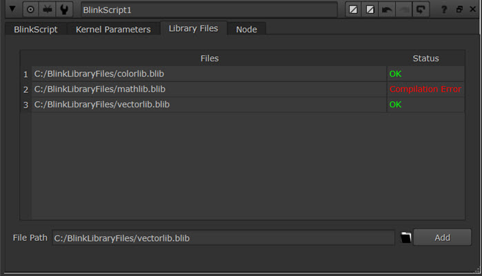 Note: Errors in Library Files are caught by the BlinkScript Editor’s error handling.
