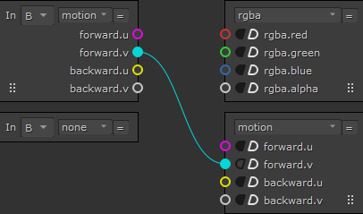 | 4. | Connect the noodles as required to shuffle the channels. In this example, we disconnect the B input's alpha channel and connect the A input's alpha channel. The resulting output layer consists of the rgb channels from B and the alpha channel from A. |