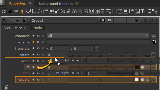 or by right-clicking in the panel and selecting Adding Knobs Manually. Drag-and-drop knobs significantly reduce the time spent managing user knobs in a node's Properties panel when compared to the legacy Manage User Knobs method within Nuke.