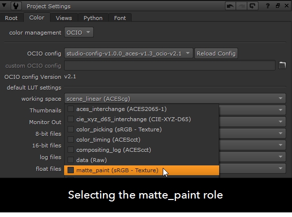 OCIO roles allow you to set custom role names for different colorspaces to make it easier for artists to instinctively know which transform to use for any shot. For instance, if an element is coming from your matte painting department and should always be brought into Nuke as sRGB, you can create a matte painting role, which is associated with the sRGB colorspace for your artist to select.