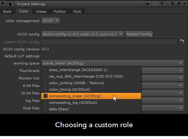 - You can now pick your role from the default LUT settings. For example, you can set the working space to compositing_linear if you want to work in the ACEScg colorspace.