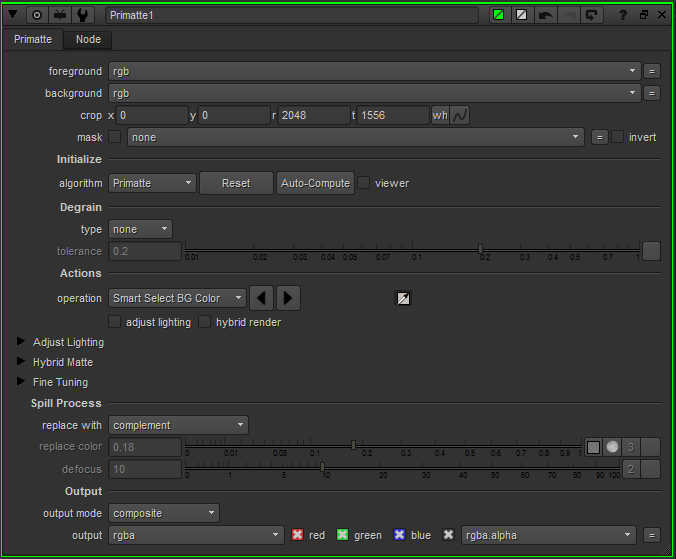 | 4. | When you select the Primatte node, the Primatte properties panel displays. |