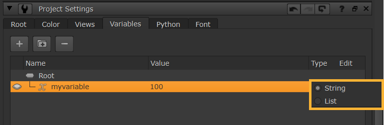 Tip:  The List option is useful when using the VariableSwitch node, allowing you to switch inputs based on the current scope being viewed or rendered. Because you have a fixed set of possible Values, you can use the values to choose between specific shots. See Using the VariableSwitch Node.