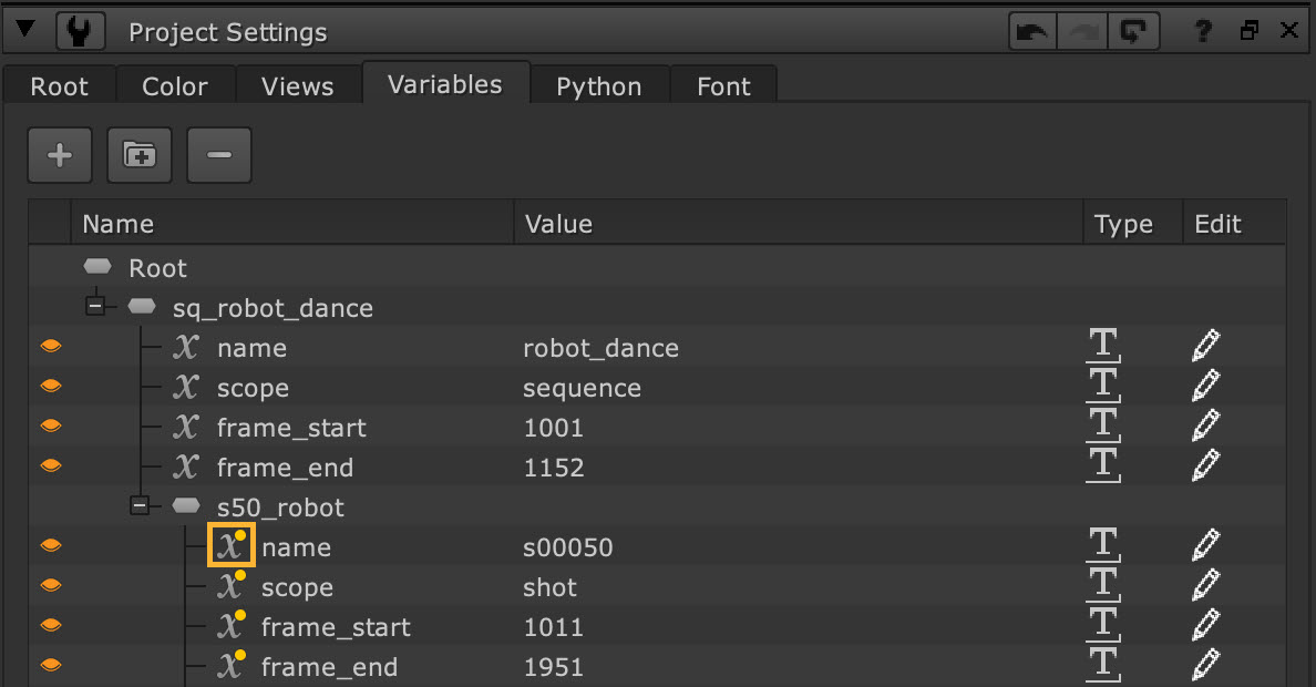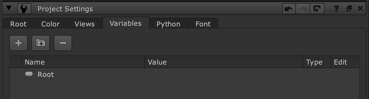 Note:  Any updates to the Variable Names will update the Variables tab in both the VariableGroup node and the Project Settings panel. Valid Names are the ones that begin with an alpha character [a-zA-Z] or '_' (underscore), followed by any number of alphanumeric characters or underscores. Examples of valid names are: '_shot', 'Shot', 'shot01'. Non compliant names will be ignored by the GsvKnob.