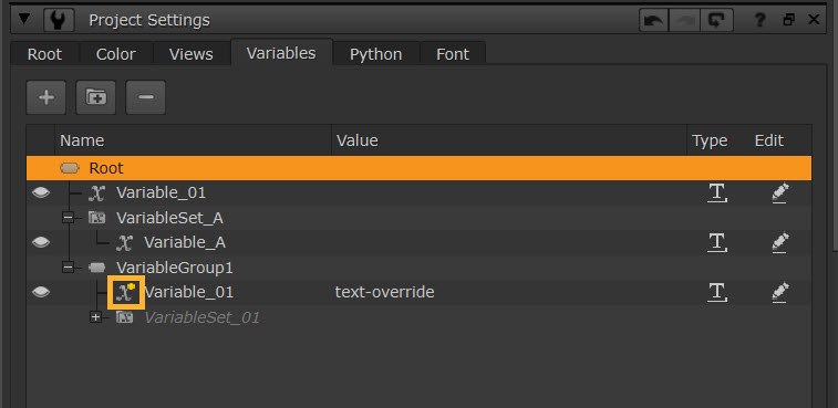 When a VariableGroup node is first added to the script you’ll notice that Variables from its parent(s) are automatically inherited and displayed in the tree view. These are denoted by an inherited Variable icon (green) and italicised/dimmed Name and Value.