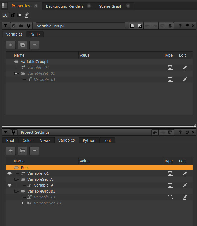 This combination of Graph Scope Variable and VariableGroup nodes provides the ability to define typical production hierarchies and create, store and override Variables at each level as required.