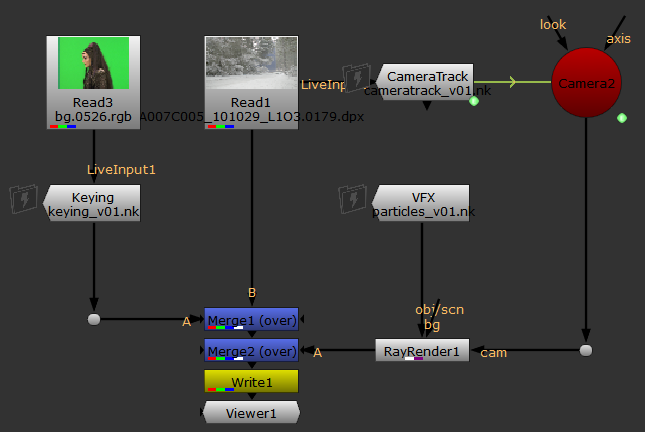The LiveGroup node is different to Precomps and Groups in that it allows multiple artists to work on the same script at the same time, drawing work from disparate scripts into the source script. A simple example is shown below, where the Keying, CameraTrack, and VFX LiveGroups contain the node trees for those operations in separate scripts.