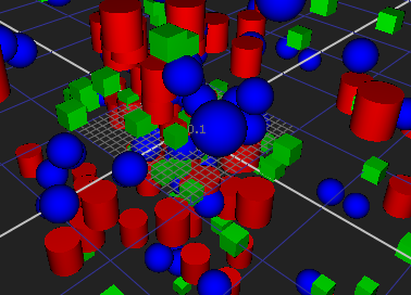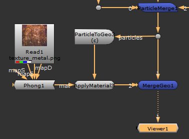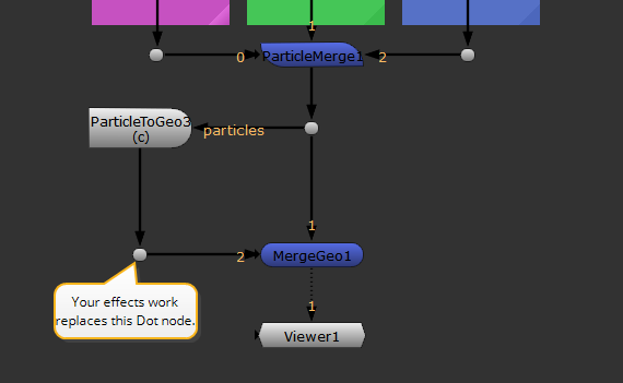 The following example uses a very simple particle system containing three colored particles in separate channels and adds effects to one channel using ParticlesToGeo. The other particles are unaffected.