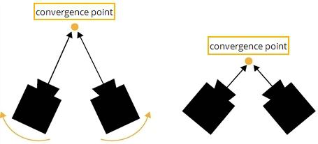 The ReConverge node lets you shift convergence (the inward rotation of the eyes or cameras) so that any selected point in the image appears at screen depth when viewed with 3D glasses. This point is called the convergence point. It is the point where the lines of sight from the two cameras meet.