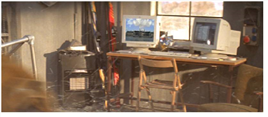 The CornerPin2D node is designed to map the four corners of an image sequence to positions derived from tracking data. In practice, this node lets you replace any four-cornered feature with another image sequence. For example, suppose you needed to replace the monitor image in the fast-panning shot shown below.