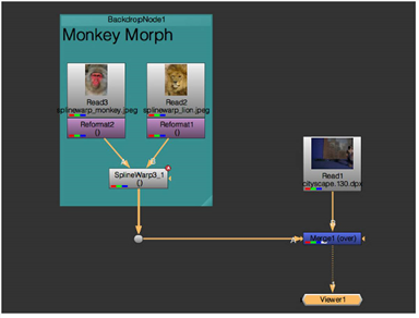 Finally, merge the output of the SplineWarp node with your sequence. A simple script might appear as follows: |