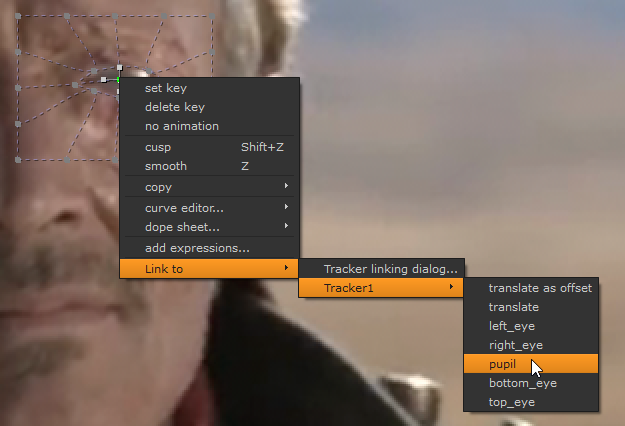 | 4. | After tracking your points successfully, right-click a vertex on the grid that corresponds to a tracking anchor and select Link to > Tracker1 and then the name of the track. For example, pupil as shown in the example. |