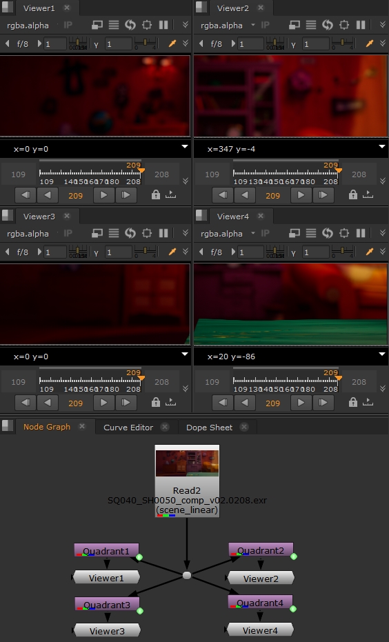 Each quadrant is a Crop node that defines which part of the overall image is handled by each Viewer. For example, Quadrant3 is set up as shown here, with simple expressions to handle different formats.