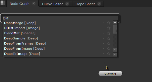Typing in the Tab menu narrows the selection. For example, entering the string dea displays all entries beginning with dea. In this case, you can see that there are no nodes beginning dea, so Nuke looks instead for node beginning de with an a in the name.