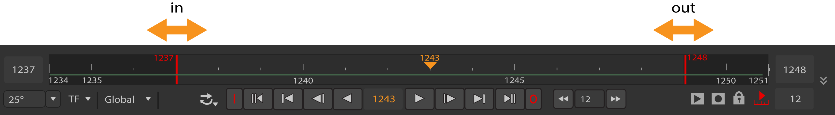 To adjust the playback range for the current Viewer window, click+drag the red playback range markers on the timeline to a new “in” and “out” frames as shown below, or enter a new playback range in the playback range field and press the frame range lock button.