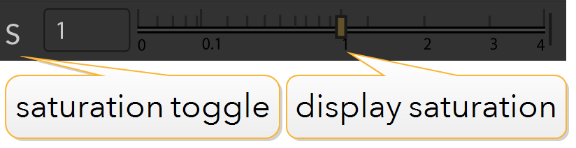 The gain, gamma and saturation sliders let you adjust the displayed image, without affecting your final output. These controls are useful for tasks like spotting holes in mattes. You can boost or reduce gain by entering a multiplier (exposure value), dragging on the slider, or using the F-Stop arrows. Boost or reduce gamma by entering a gamma level or dragging the gamma slider. Saturation correction is applied after the gain and Viewer processes, and any custom input process. Saturation uses Rec709 coefficients to compute luminance, and uses the same color space as that which is set in the Viewer.